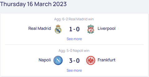 지금까지 UEFA 챔피언스리그 16강 2차전 나폴리 대 프랑크푸르트 그리고 레알 마드리드와 리버풀의 경기 결과를 알아보고 챔스 8강 대진표 추점 일정에 대해 포스팅하였습니다. 오늘도 좋은 하루 되시고 다음 포스팅도 기대해 주시기 바랍니다. GoatAboutFootball이었습니다.