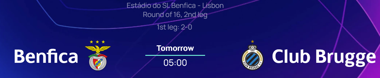 1. 벤피카 클럽 브뤼헤 챔피언스리그 16강 2차전 경기 일정 및 중계