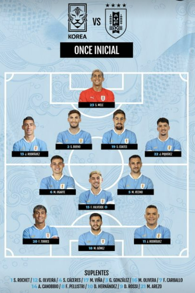 우루과이의 선발 명단 입니다. 골키퍼에는 멜레 골키퍼가 장갑을 꼈습니다. 수비에는 로드리게스, 부에노, 코아테스, 피케레즈가 나섰고, 그 위에 우가르테, 베시노가 수비형 미드필더로 선발 출장하고, 2선에선 발베르데가 공격을 지원합니다. 전방에는 토레스, 로드리게스, 고메즈가 선발 출장합니다.