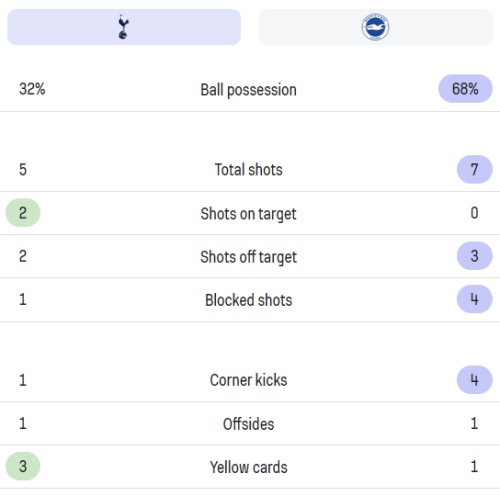 토트넘 브라이튼 경기기록 후반전 입니다. 손흥민의 토트넘은 후반전들어 더욱 점유율을 브라이튼에게 내줍니다. 슈팅숫자를 보는 것과 같이 7회로 5회의 토트넘보다 2회 많았습니다. 다만 토트넘은 유효 슈팅이 2개를 기록했고 브라이튼은 0개를 기록했습니다. 토트넘은 유효 슈팅 2개중 1골을 기록했습니다.