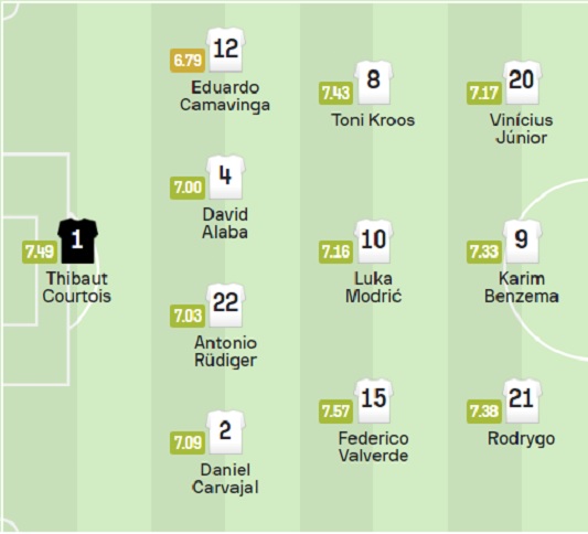 먼저 홈팀인 레알 마드리드의 선발 라인업을 예상해 보겠습니다. 안첼로티 감독은 주로 4-3-3 포메이션을 사용하고 있으며 골키퍼에는 벨기에 국가대표인 쿠르투아가 선발로 나올 것입니다. 카마빙가, 다비드 알라바, 안토니오 뤼디거, 카르바할이 4백을 구성할 것입니다. 2선에는 토니 크로스, 루카 모드리치 그리고 국민 밉상인 우루과이의 발베르데가 나서며 3 톱 공격에는 비니시우스, 호드리구, 벤제마가 선발로 출장할 것으로 보입니다.