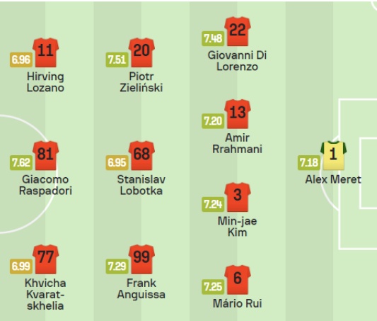 먼저 나폴리의 이번 챔스 8강 예상 선발 라인업 입니다. 기본적으로 4-3-3 포메이션을 사용하는 나폴리는 골키퍼에 메렛이 어김없이 나설 것입니다. 4백에 디 로렌초, 김민재, 라흐마니, 마이로 후이가 예상됩니다. 그 위 중원에는 로보트카와 잠보 앙귀사가 나서며 지엘린스키와 로사노, 흐비차 크바라치헬리아가 2선에 서겠습니다. 현재 내전근 부상으로 출장하지 못하는 빅터 오시멘을 대신하여 라스파도리가 원톱으로 나오지 않을까 예상해 봅니다.